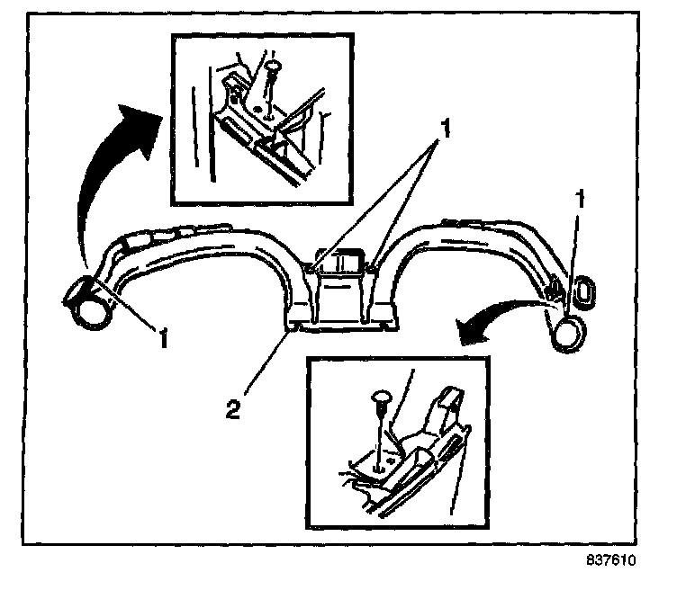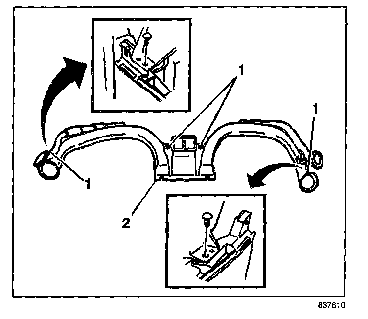 4. Remove the four push clips (1) from the lower air distribution duct (2).
