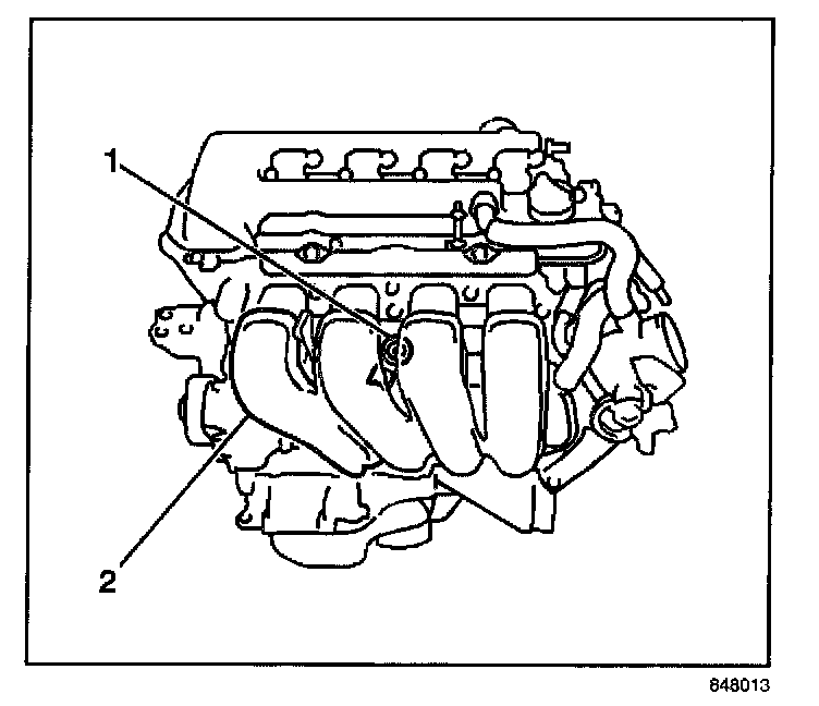 KNOCK SENSOR (KS)The knock sensor (KS) (1) is located below the intake manifold (2), on the engine block between cylinder 2 and cylinder 3. The KS (1) detects engine detonation and sends a signal to the PCM. The PCM uses the input from the KS to adjust the ignition timing in order to control detonation. For detailed information on the operation of the KS refer to Knock Sensor (KS) System Description.