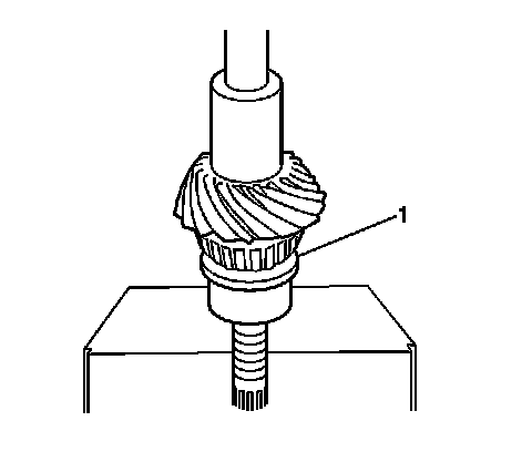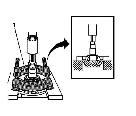 24. Remove the drive pinion rear bearing from drive pinion using J 22912-01 (1) and a press.