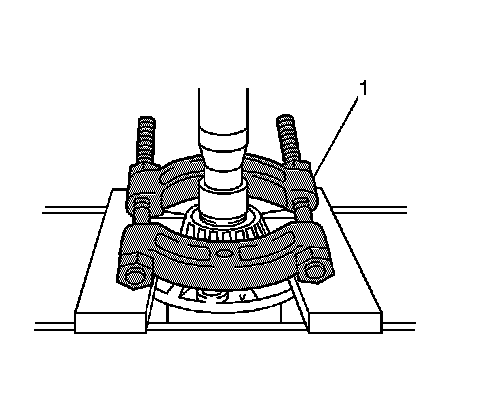 25. Remove the differential case side bearings from the differential case using J 22912-01 (1) and a press.