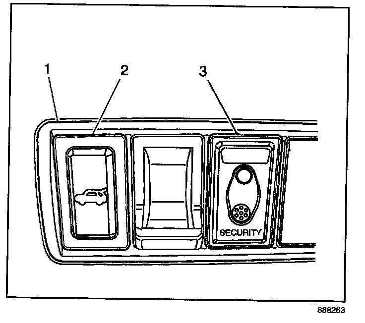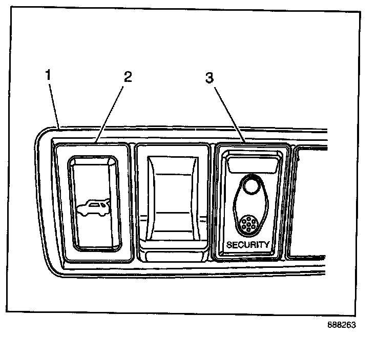 1. Using a taped flat bladed tool, gently pry the security indicator lamp switch (3) from the instrument panel (1).