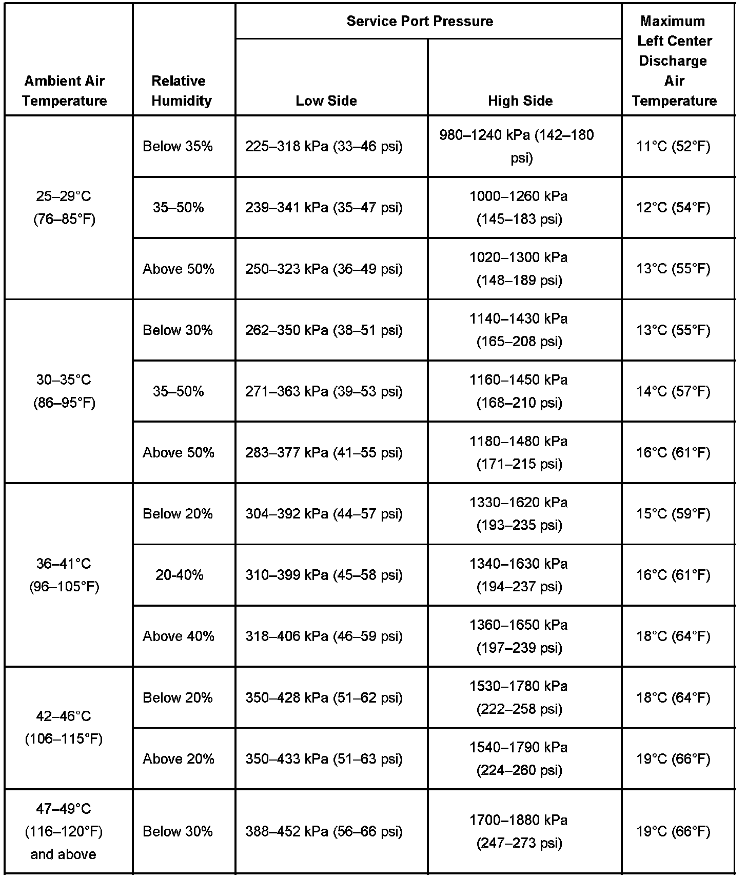 A/C System Performance Table