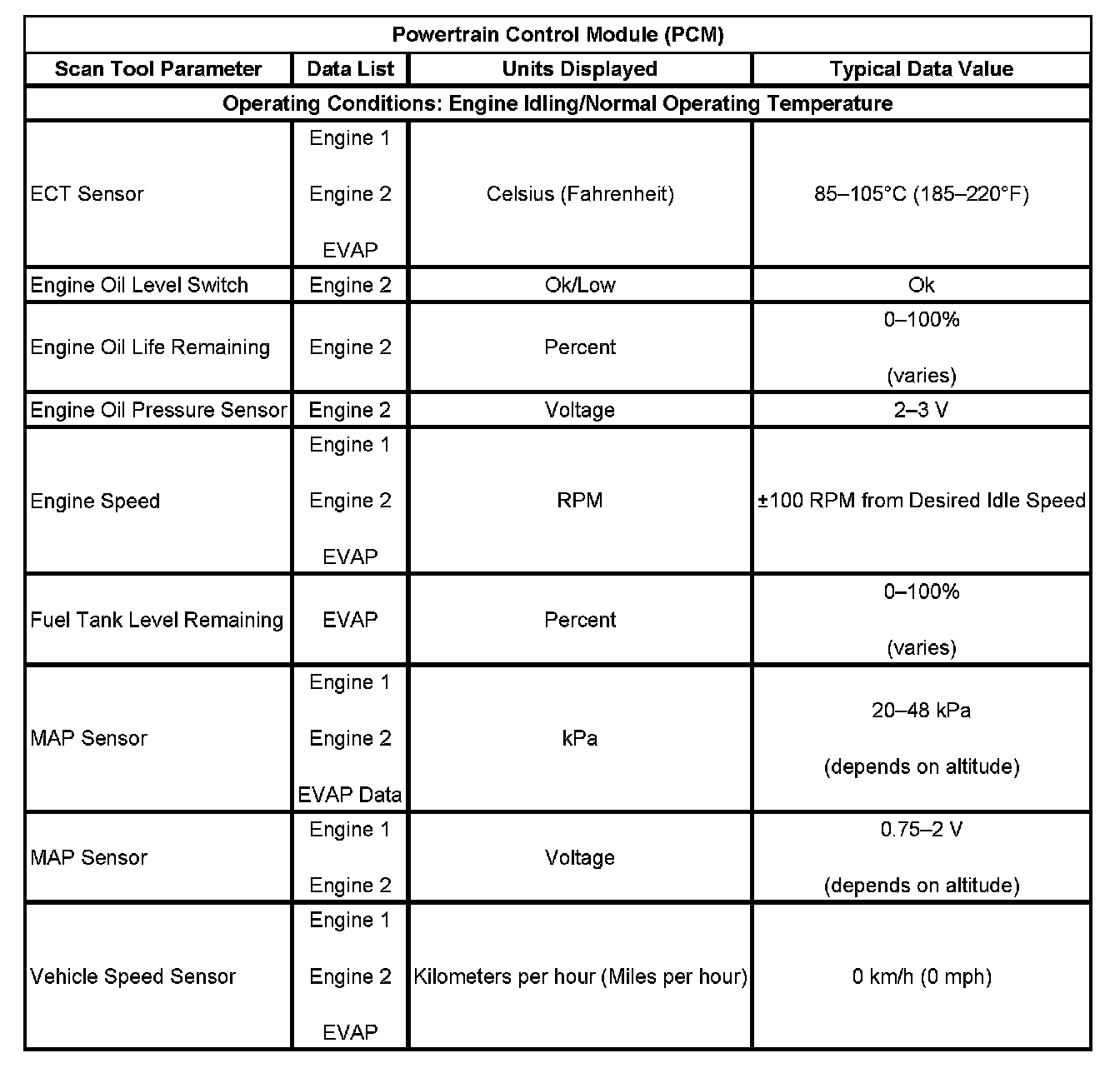 Scan Tool Data List - Powertrain Control Module (PCM)