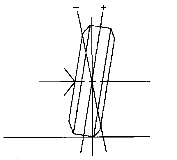 Camber is the tilting of the wheels from the vertical when viewed from the front of the vehicle. When the wheels tilt outward at the top, the camber is positive (+). When the wheel tilts inward at the top, the camber is negative (-). The amount of tilt is measured in degrees from the vertical. Camber settings influence the directional control and the tire wear.