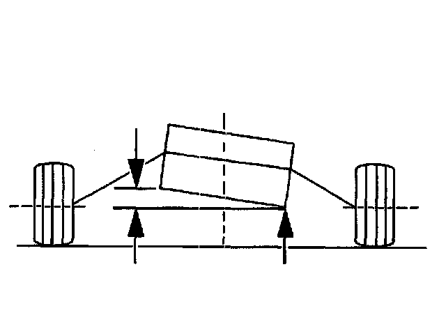 ^ Left-to-right differences in the front view axle angle may cause significant steering pull in a vehicle. The pull will be to the side with the most downward sloping axle from the differential to the wheels. Axles typically slope downward from the differential. The slope of the transaxle pan to level ground may be used as an indication of bias axle angles. The side with the higher transaxle pan, shown on the left side of the illustration, has the most downward sloping axle angle.