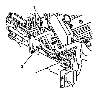 3. Remove the bolt (1) securing the engine ground cable (2) to the right side body frame rail.