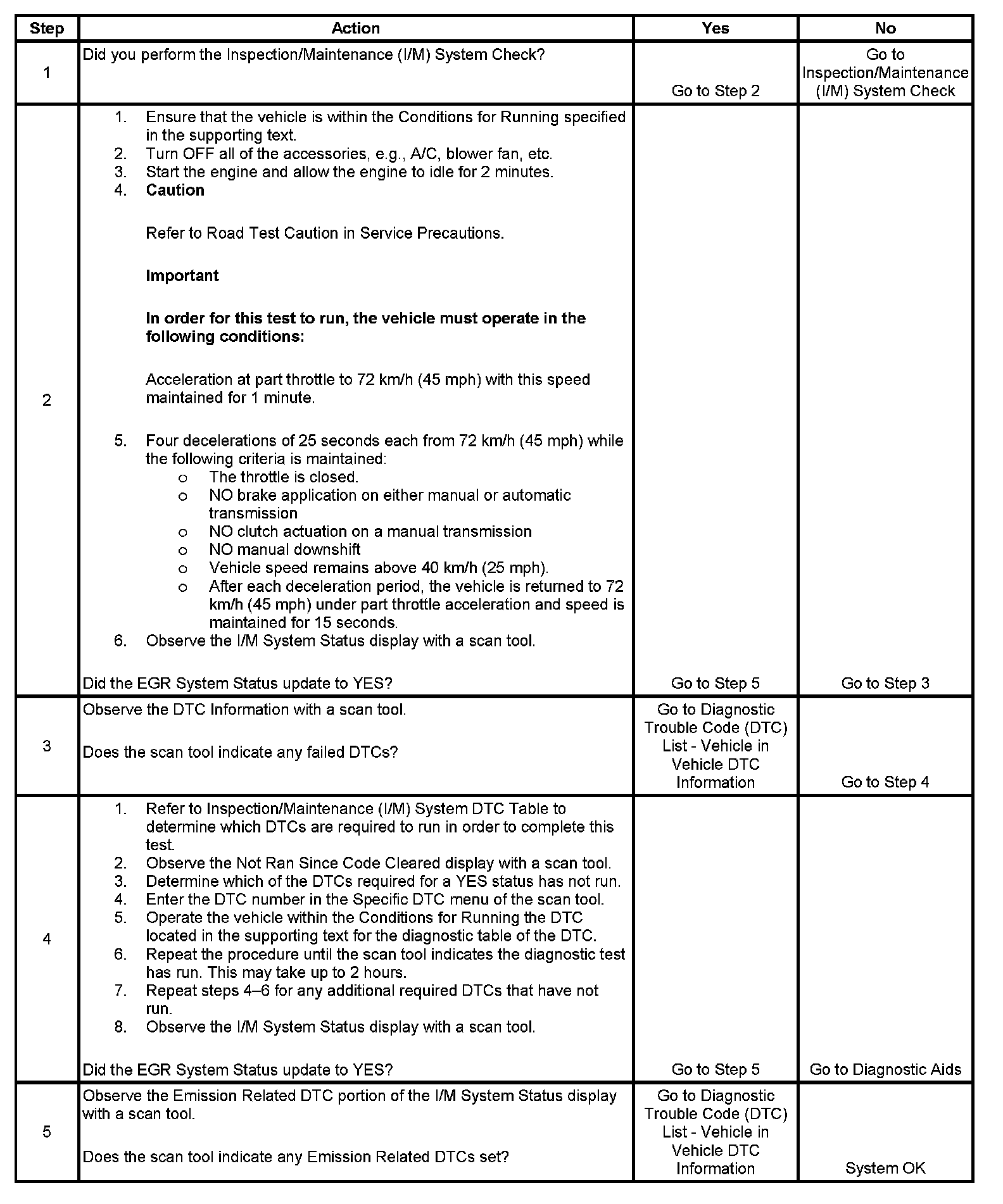 The control module only runs the EGR Active Tests during a gradual deceleration with a closed throttle and a vehicle speed above 37 km/h (23 mph). Several deceleration cycles may be necessary in order to accumulate a sufficient number of EGR flow samples. The procedure outlined in the table is for a clear, flat road. If the procedure is performed on a road with a slight down hill grade, the test may acquire the necessary sample counters in one or two decel trips. If the test is interrupted during the procedure, more than 10 deceleration cycles may be needed to complete the test. If the status does not update, the test outlined in this procedure can be repeated until the I/M System Status updates to YES.