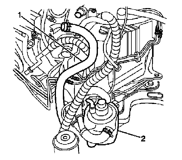 3. Lower the splash shield far enough to gain access to the secondary air injection (AIR) pump (2) assembly.