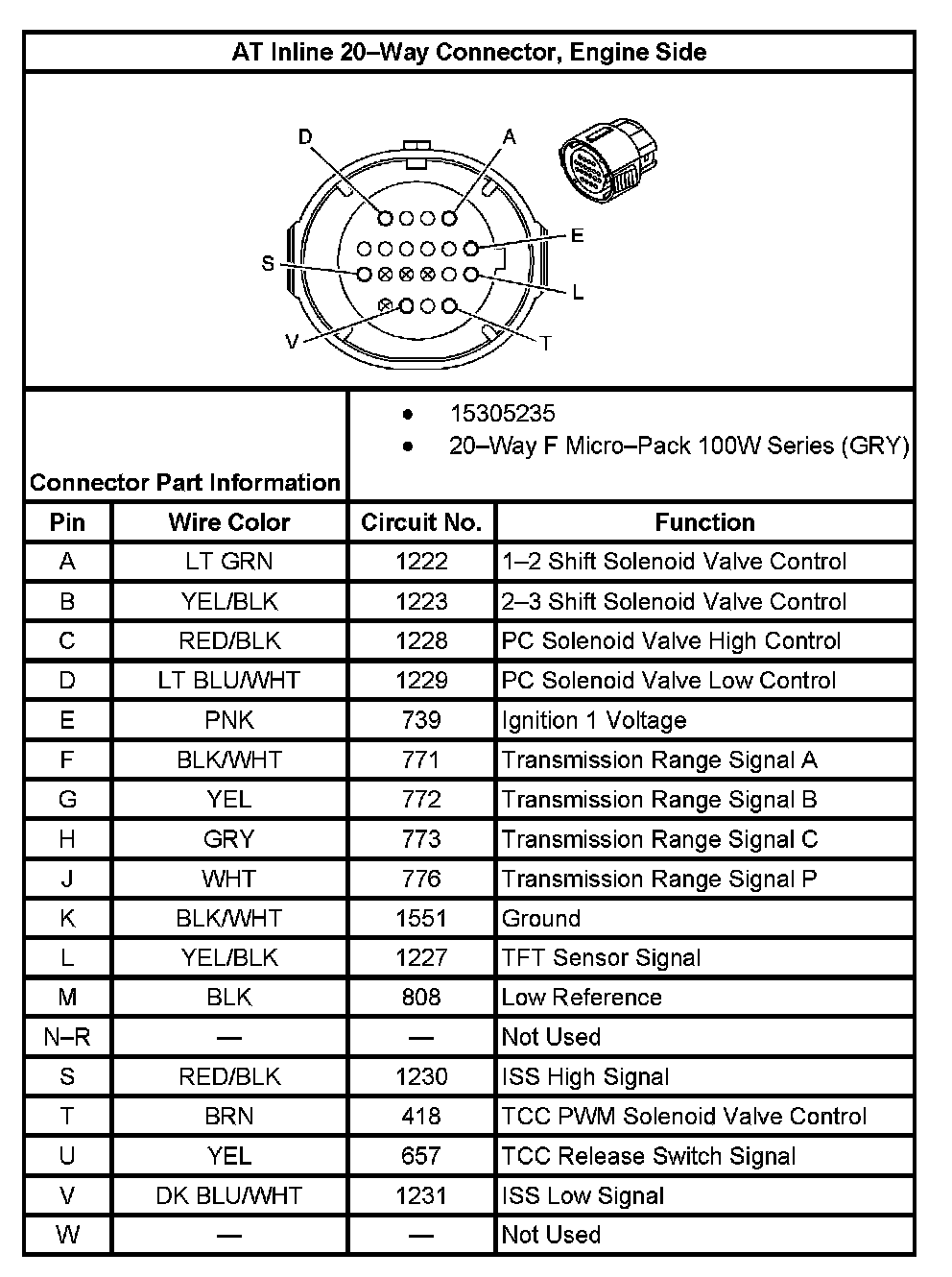 Automatic Transmission Inline 20-Way Connector End View: