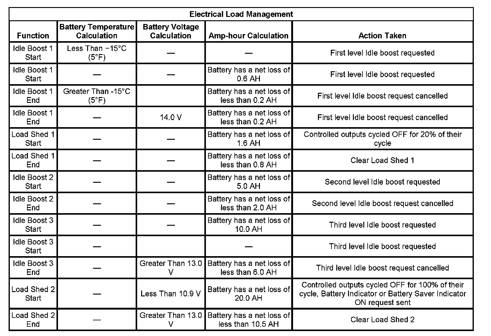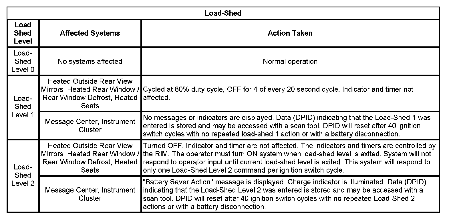 Electrical load management is designed to maintain battery voltage and covers more than load-shed. The dash integration module (DIM) will request increases in idle speed from the powertrain control module (PCM), when the vehicle is in park or neutral, as well as turn off loads in order to manage the electrical system and preserve the vehicle electrical power availability. The DIM calculates the battery temperature, voltage and charging rate at all times while the engine is running.