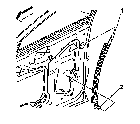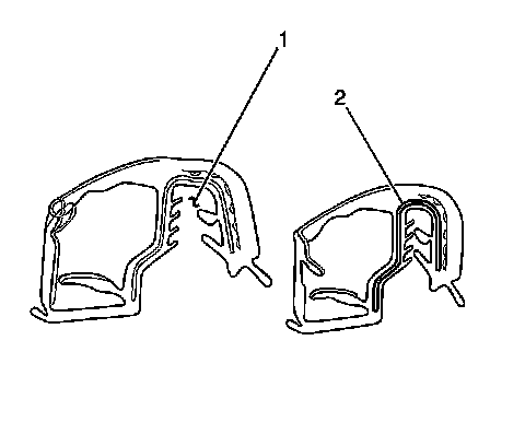 Important: When reusing the window weatherstrip, the flange mounting area (1) must be pinched together to counteract the splaying effect when removed. Use thumb and index finger to pinch the carrier (2) back together. Work from one end of the weatherstrip to the other.