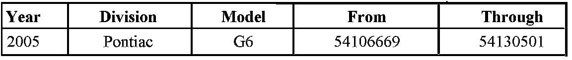 Involved are certain 2005 model year Pontiac G6 vehicles built within the VIN breakpoints shown.