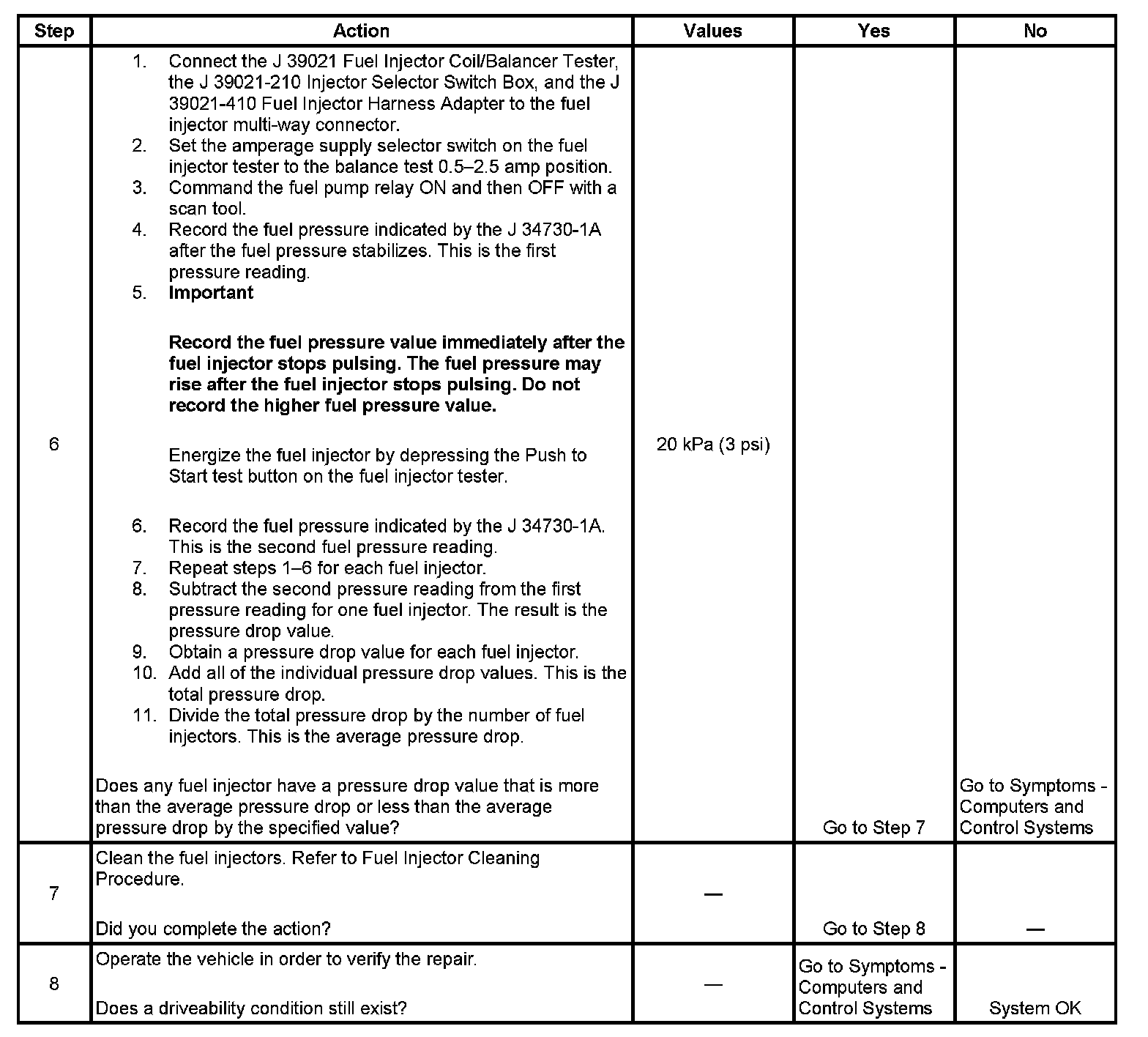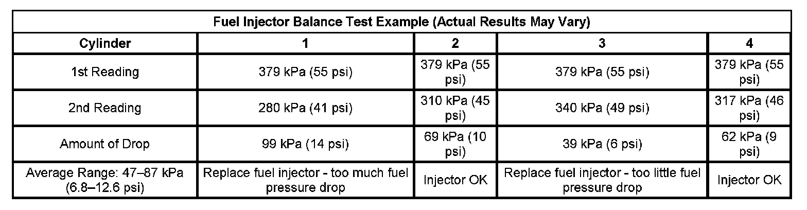 6. If the pressure drop value for each fuel injector is within 20 kPa (3 psi)of the average pressure drop value, the fuel injectors are flowing properly.