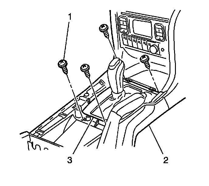 5. If equipped with an automatic transmission, remove the 4 screws (1), attaching the console (2) to the shifter assembly (3).