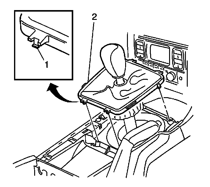 6. If equipped with a manual transmission, use a flat-bladed tool to disengage the retaining tabs (1) attaching the manual transmission shifter boot assembly (2) to the console.