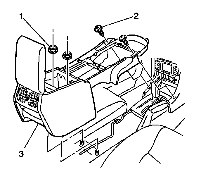 10. Remove the two nuts (1) attaching the floor console (3) to the vehicle floor.