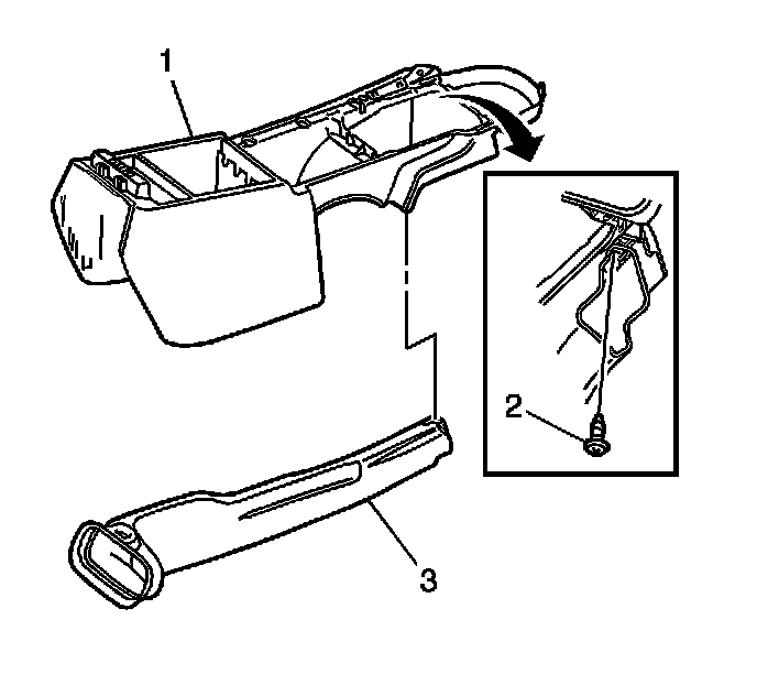 16. Remove the screw (2) attaching the floor console rear air duct (3) to the floor console (1).