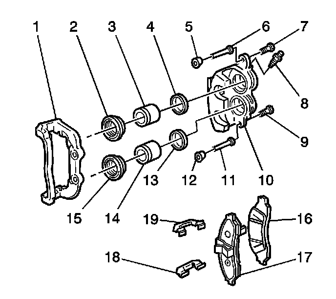 10. Remove the 2 brake pads (16,17) and the 2 spring clips (18,19).