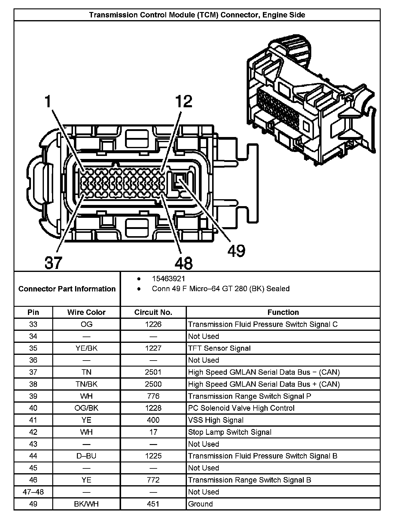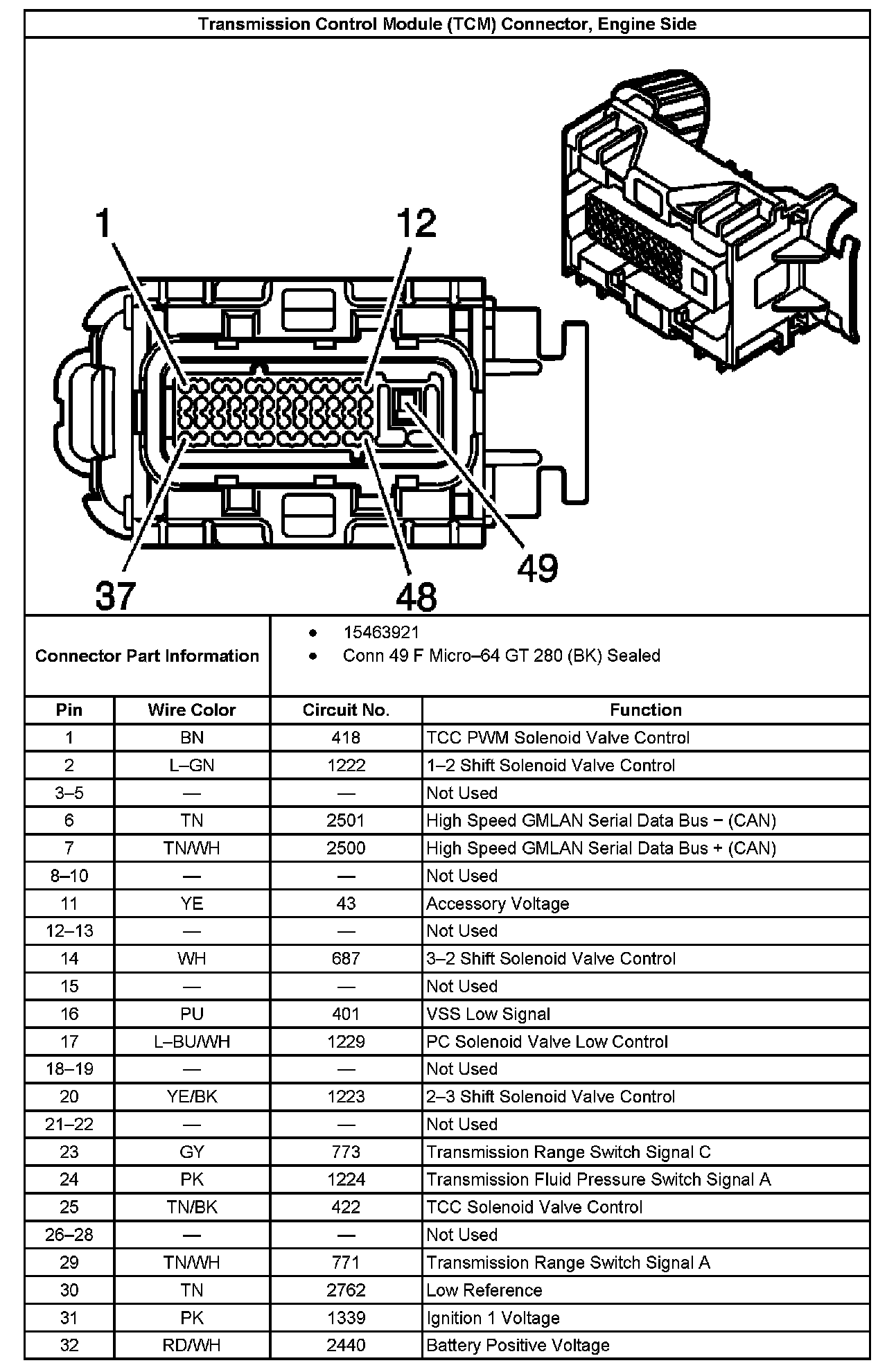 Transmission Control Module (TCM) Connector, Engine Side: