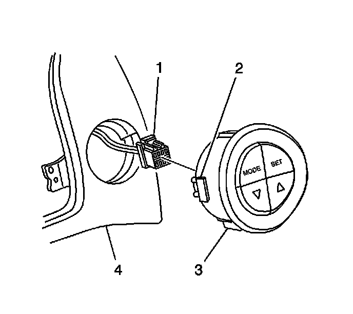 5. Using a plastic flat-bladed tool, hold the retaining clips (2) depressed while slowly removing the switch (3) from the panel (4).