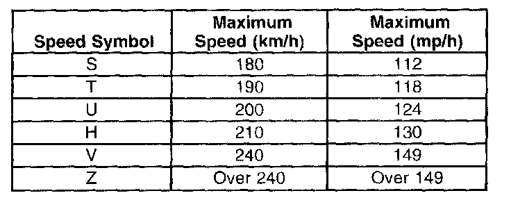 This vehicle is equipped with speed rated tires. Listed below are the common speed rating symbols and the corresponding maximum speeds: