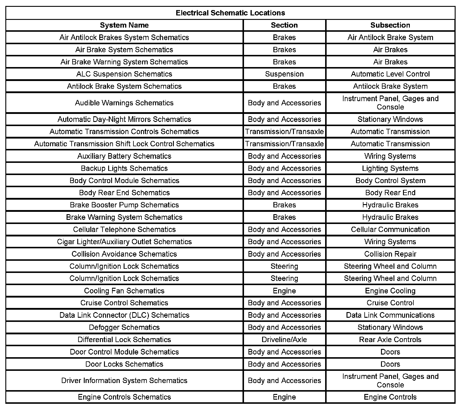 Electrical system schematics are located within their respective subsections. Because more than one electrical system is located in each subsection, each electrical systems schematics are further broken down into operating systems. The table lists all electrical system schematics and the subsection in which they are located.