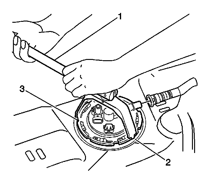 4. Using the J 45722 (2) and a half-inch breaker bar (1), remove the cover retainer lock ring (3) by turning in a counterclockwise direction.