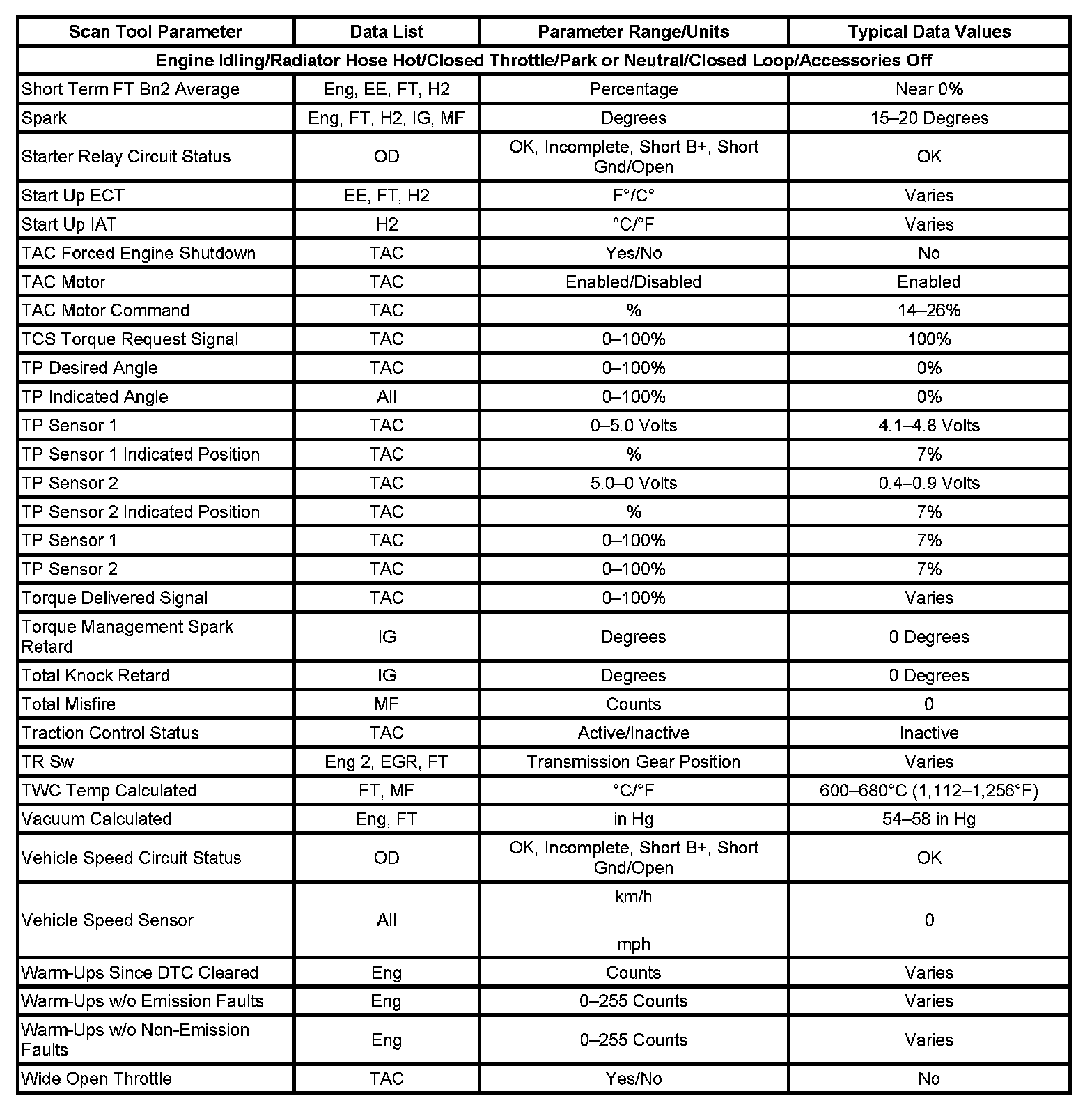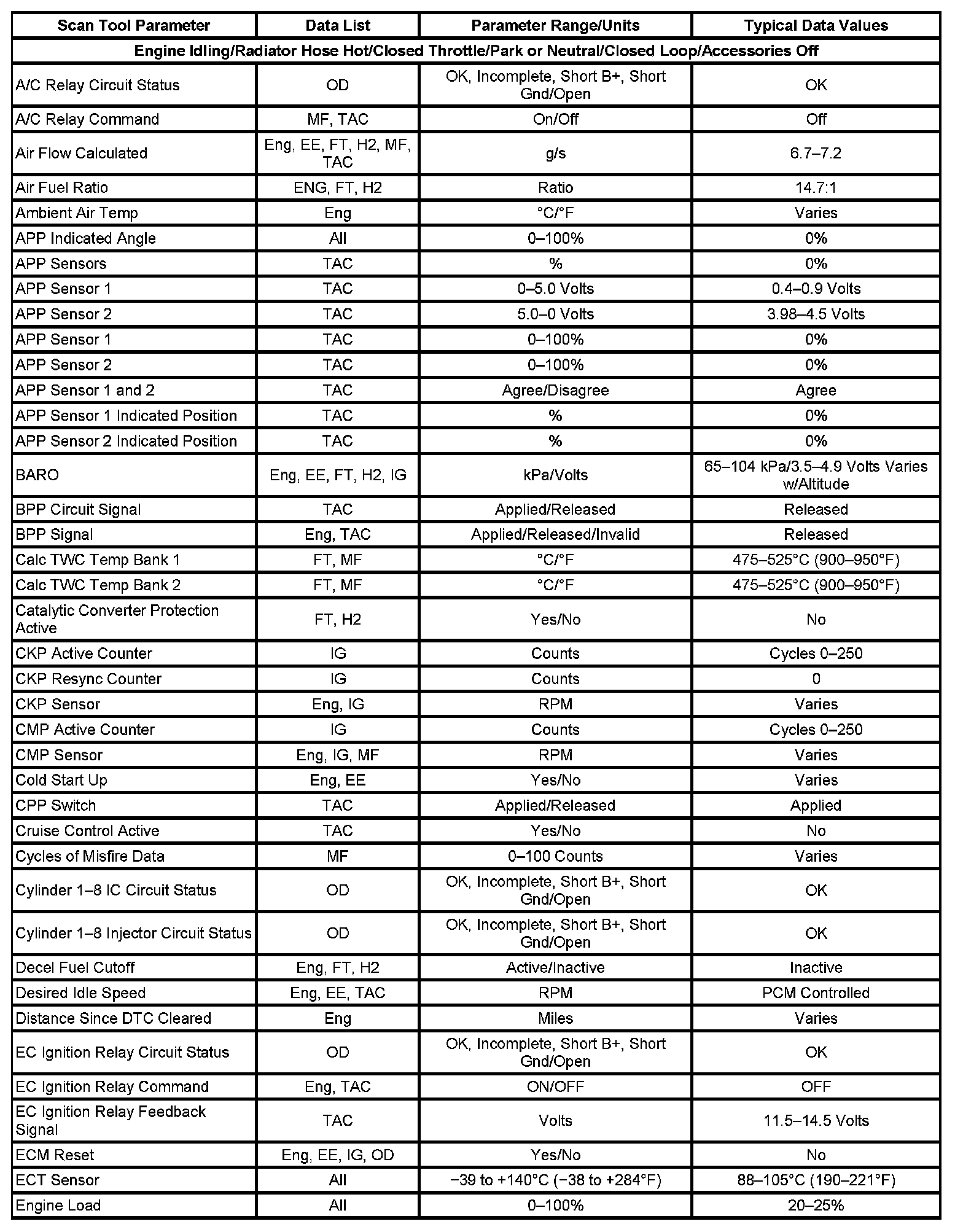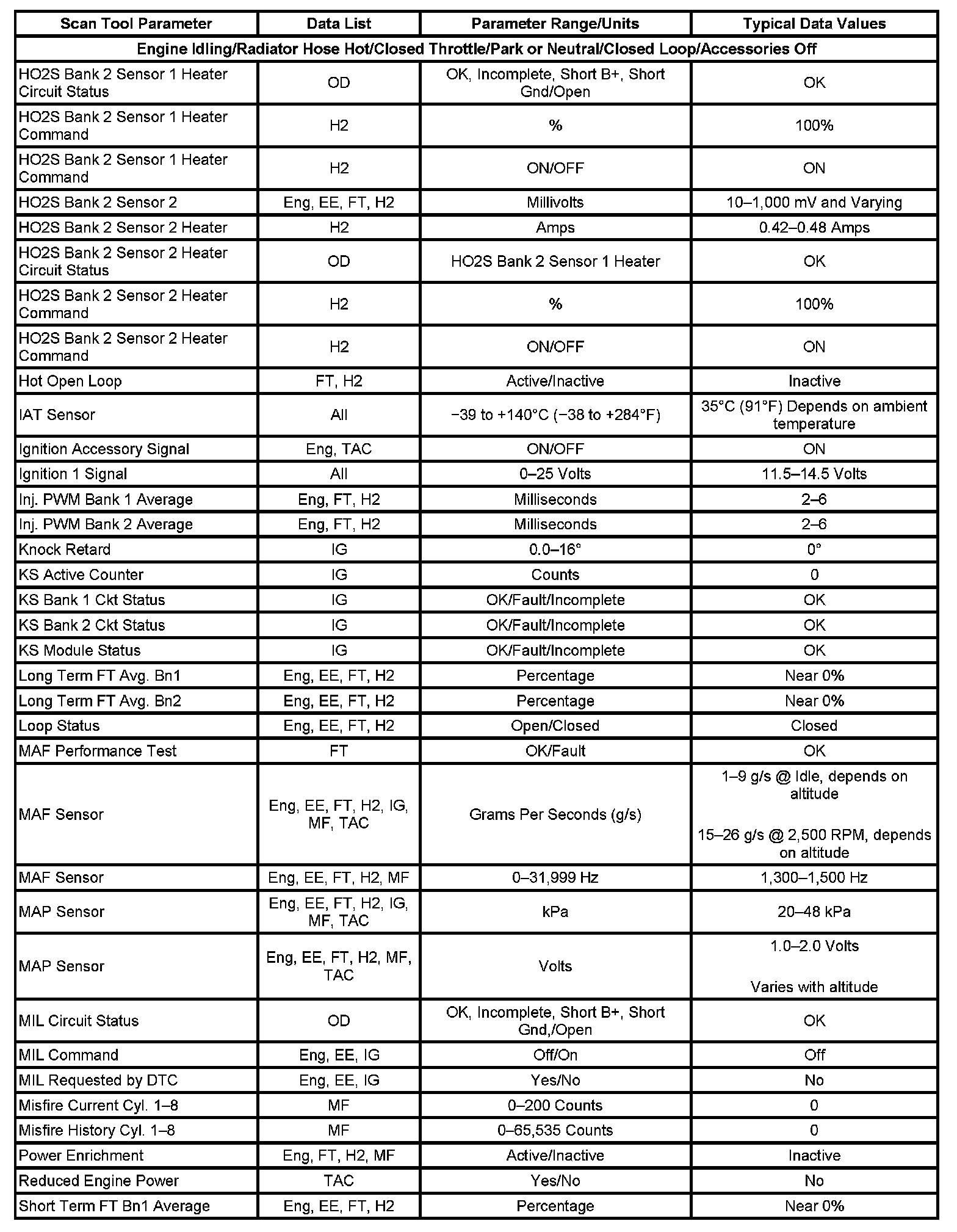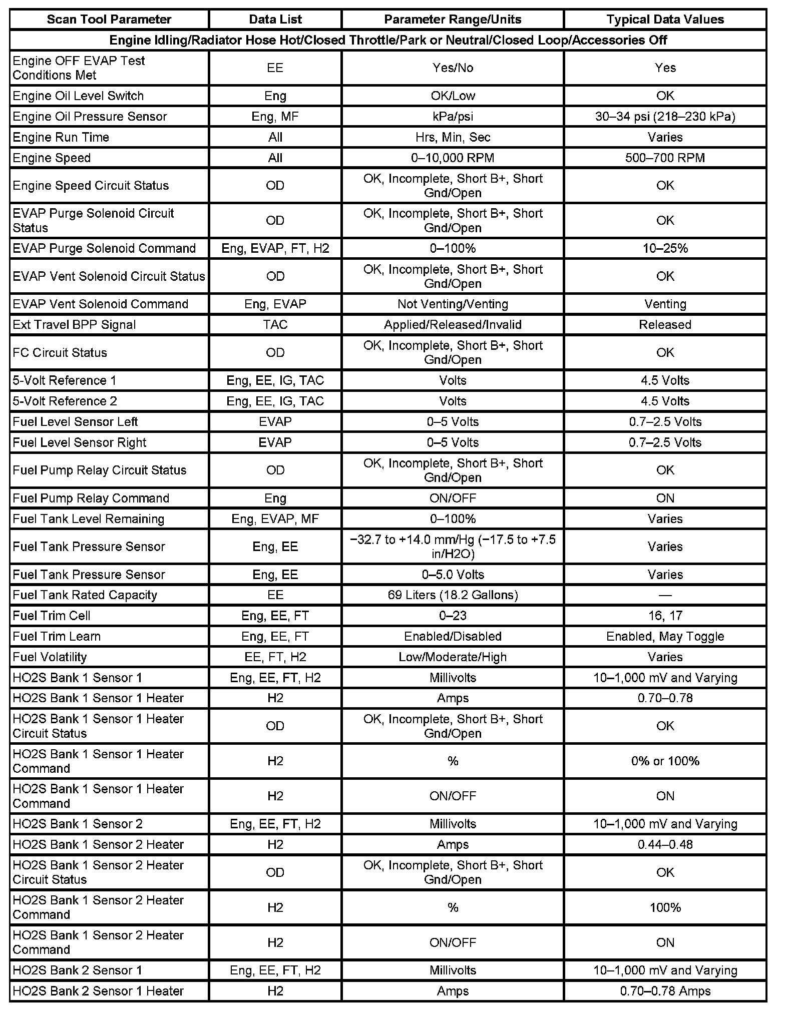 The column labeled Data List indicates where a parameter can be located on the scan tool. Refer to the scan tool operating manual for the exact locations of the data lists. The following is a description of each term listed: