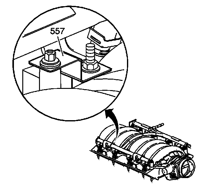 5. Install the fuel rail attaching bolts (511, 512), ground strap (557).