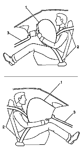 The supplemental inflatable restraint (SIR) system supplements the protection offered by the occupant's seat belt system (2). The SIR system may contain several inflator modules located throughout the vehicle, i.e. steering wheel module (1), instrument panel (I/P) module (1) and front seat belt pretensioners. Each inflator module and seat belt pretensioner has a deployment loop that is controlled by the sensing and diagnostic module (SDM) mounted inside the vehicle. The SDM determines the severity of a collision. When the SDM detects a collision of sufficient force it will process the information provided by the sensors to further support air bag deployment. The steering column (1) and knee bolsters (3) are designed to absorb energy and compress during frontal collisions in order to limit leg movement and decrease the chance of injury to the driver and passenger.