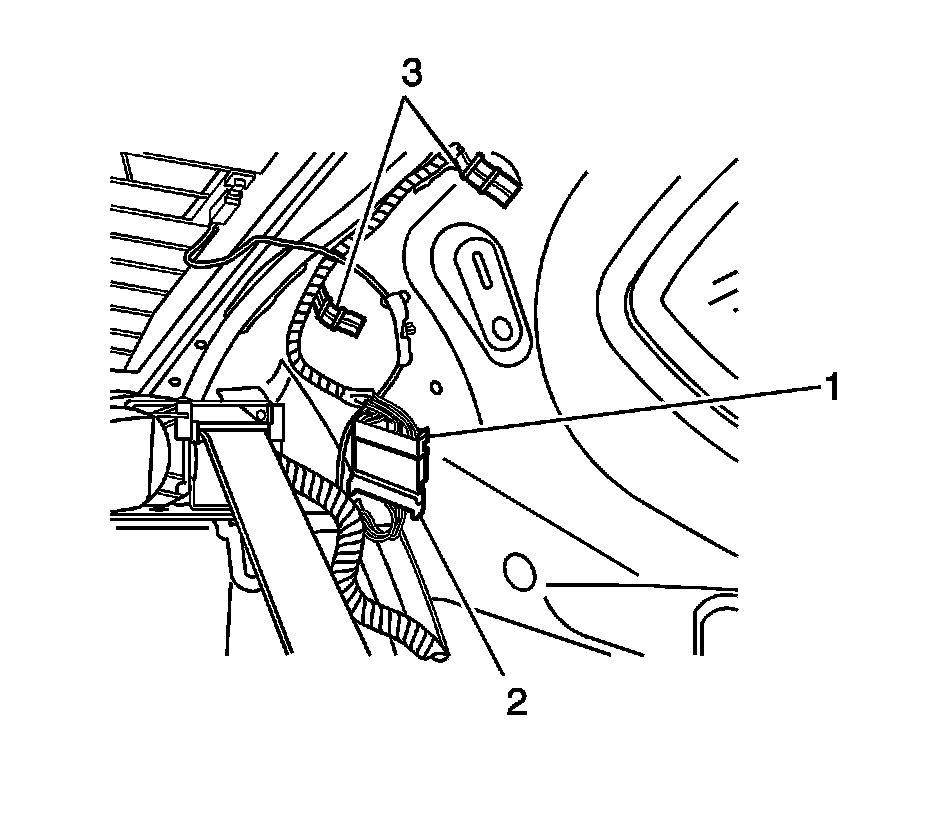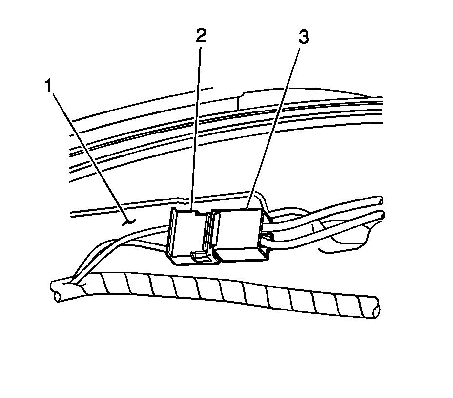 10. Pull down the headliner above the left front door. Disconnect the actuator harness connector (3) attached to the headliner (1).