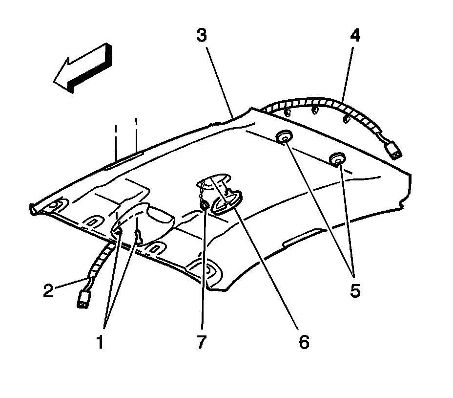 1. Position the headliner (3) in the vehicle.