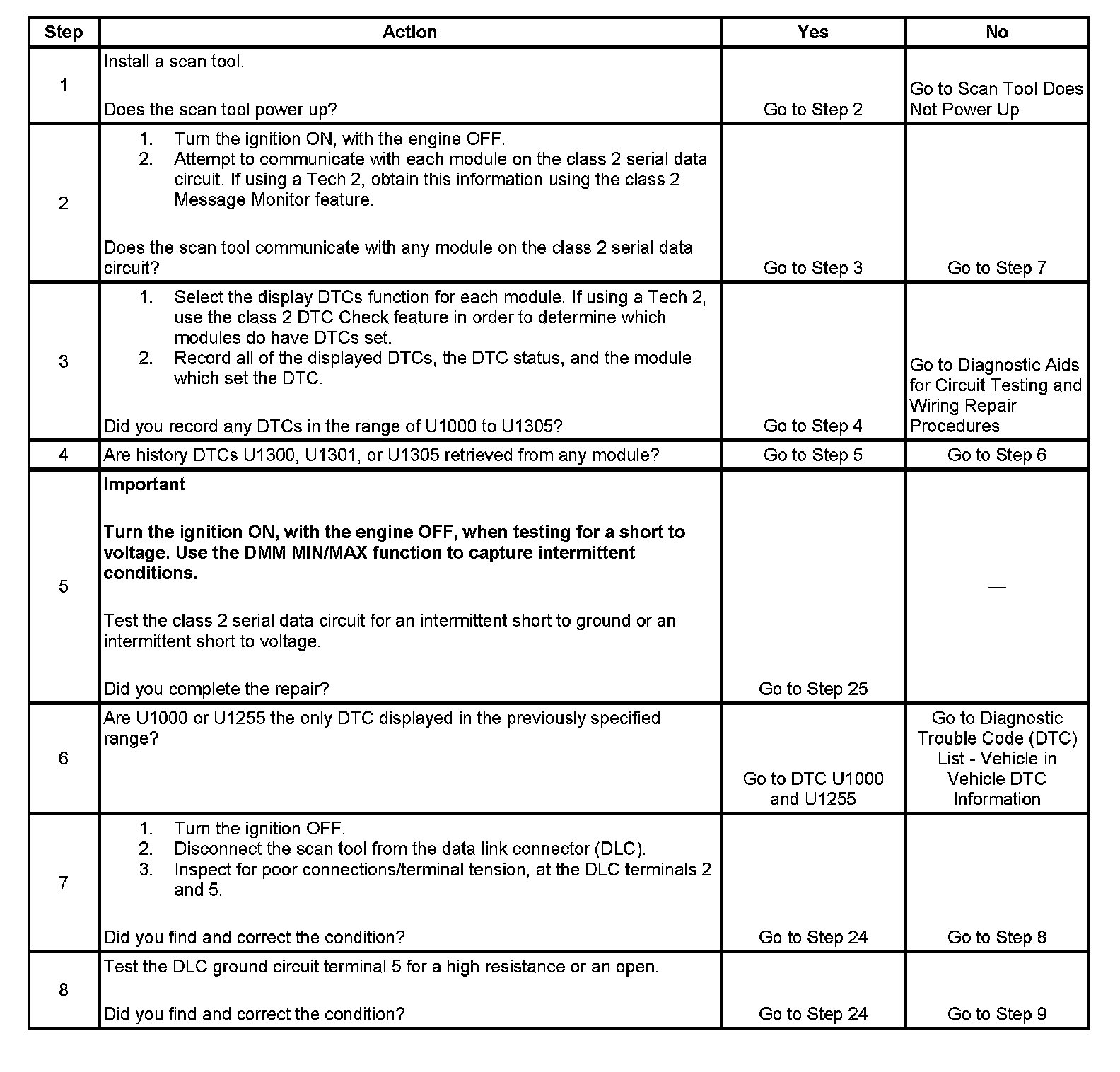 7. DLC terminals 2 and 5 provide the connection from the vehicles class 2 serial data circuit and the Tech 2. A poor connection at this connector could cause corrupted data transmissions between the 2 devices. Pin 2 is the signal terminal and pin 5 is the signal ground terminal.
