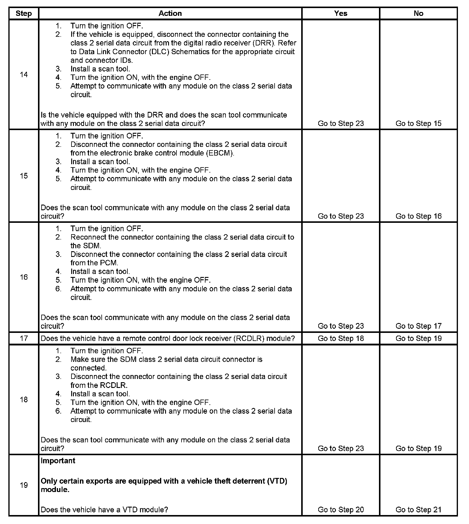 20. This is an active test of the class 2 serial data circuit with the VTD, if the vehicle is equipped, isolated from the communication bus. If you are able to communicate with the class 2 serial data circuit during this step, the VTD should be replaced.