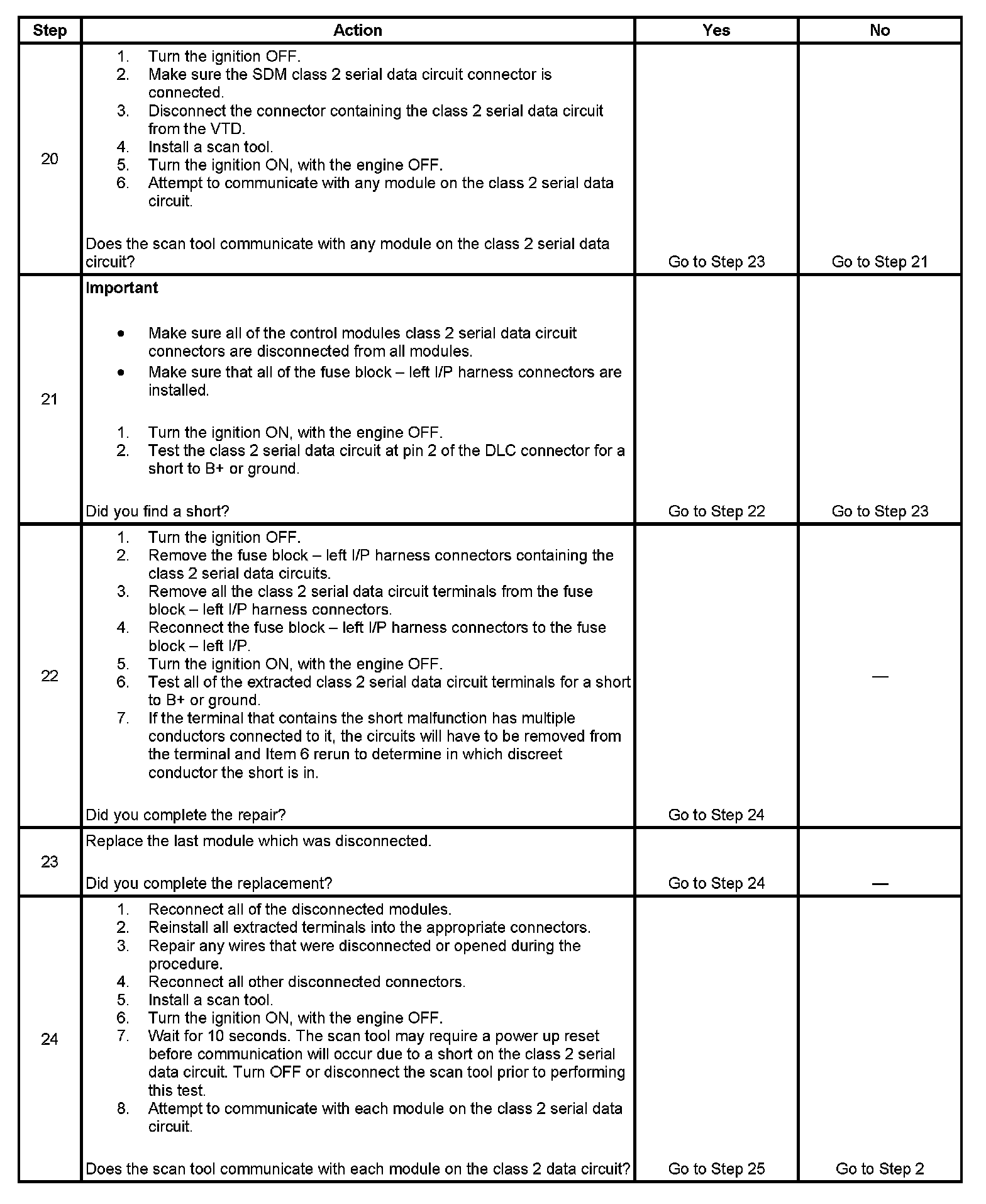 22. In this step instructions are given to analyze each branch of the class 2 serial data circuit, in order to isolate the cause of the short.