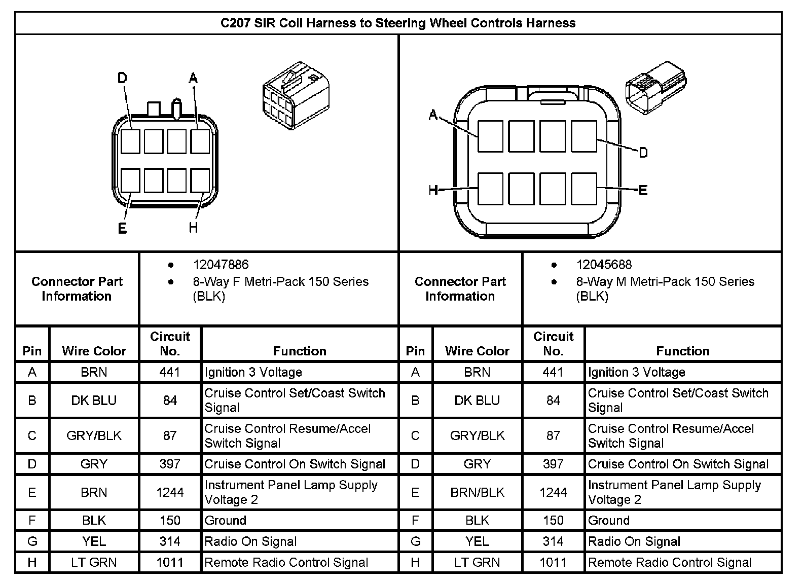 C207 SIR Coil Harness To Steering Wheel Controls Harness: