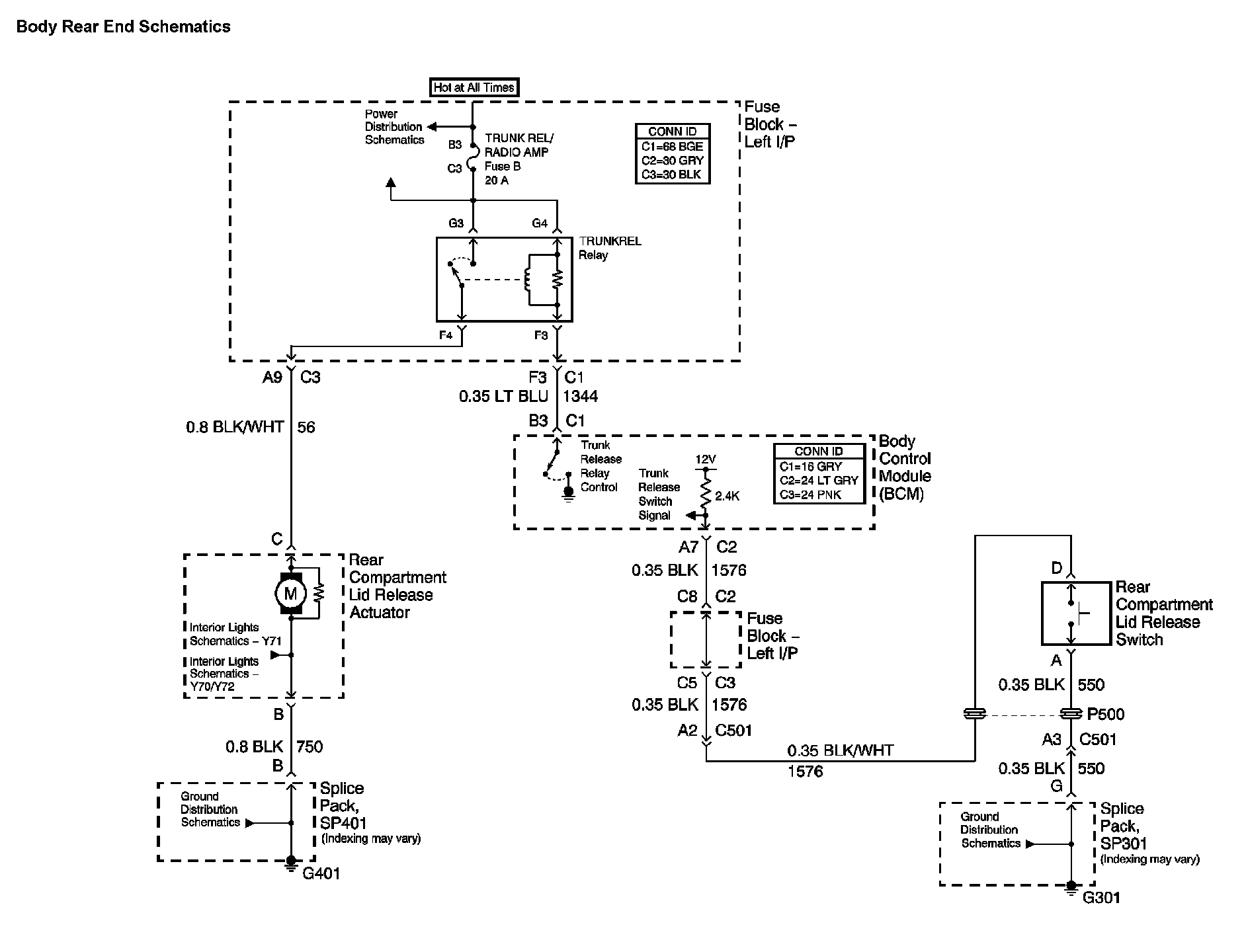 The locations for the Connectors, Grounds, Splices, and Grommets shown within these diagrams can be found via their numbers at Vehicle Locations.
