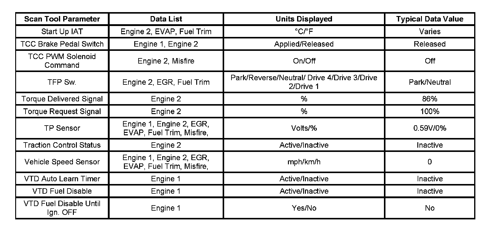 - Engine Data 1-Contains general information regarding fuel delivery, idle air control (IAC) position, heated oxygen sensor (HO2S1), HO2S2, and other basic engine operating conditions.
