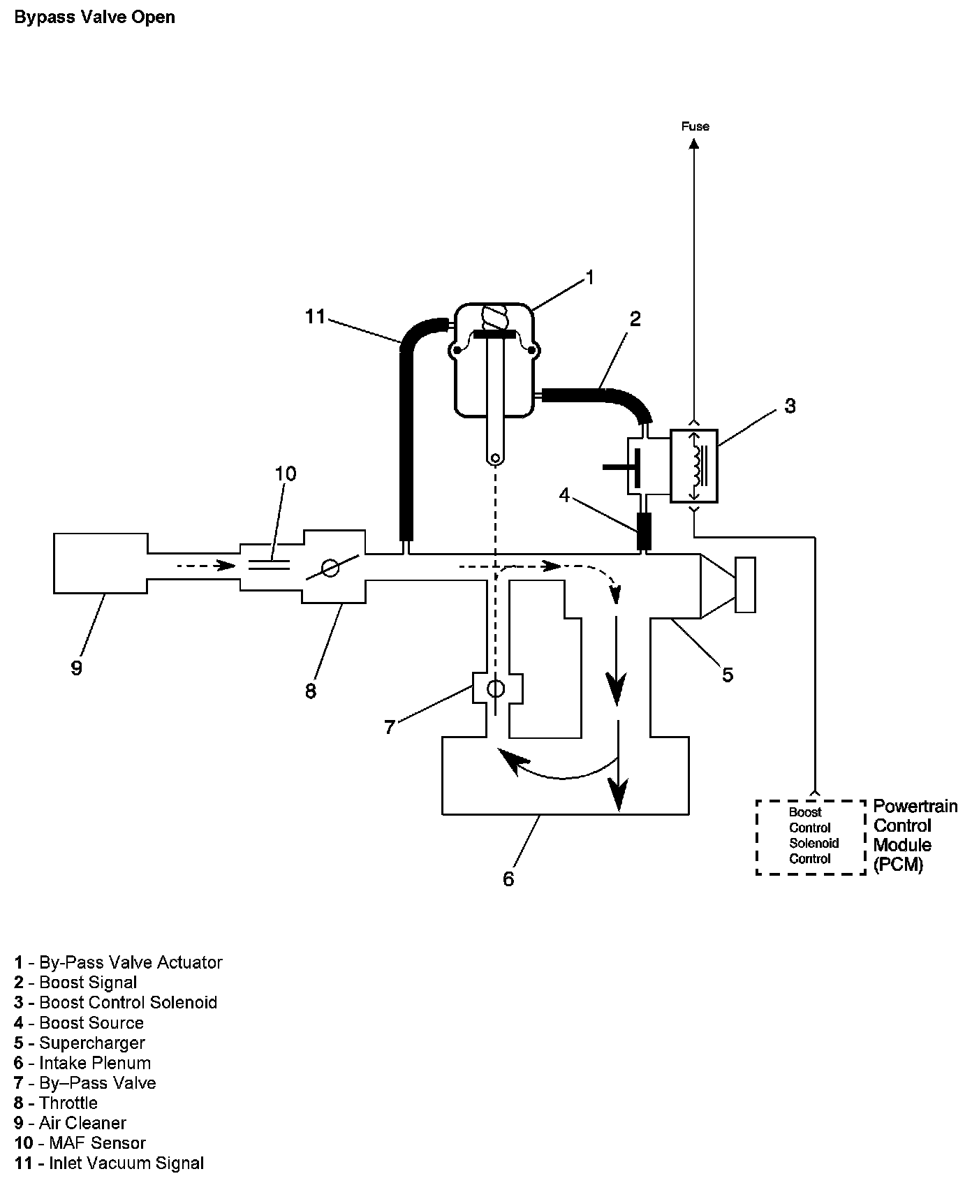 The PCM controls boost pressure by using the boost control solenoid. The boost control solenoid is normally an open valve. Under most conditions, the PCM commands the boost control solenoid to operate at a 100 percent duty cycle. This keeps the solenoid valve closed and allows only inlet vacuum to control the position of the bypass valve. At idle, engine vacuum is applied to the upper side of the bypass valve actuator, counteracting spring tension to hold the bypass valve open. As engine load is increased, engine vacuum is decreased, causing the spring in the bypass valve actuator to overcome the applied vacuum, closing the bypass valve and allowing the boost pressure to increase. When reduced boost pressure is desired, the PCM commands the boost control solenoid to operate at a 0 percent duty cycle. This opens the solenoid valve and allows boost pressure to enter the bypass valve actuator at the lower side to counteract the spring tension, opening the bypass valve and recirculating excess boost pressure back into the supercharger inlet.