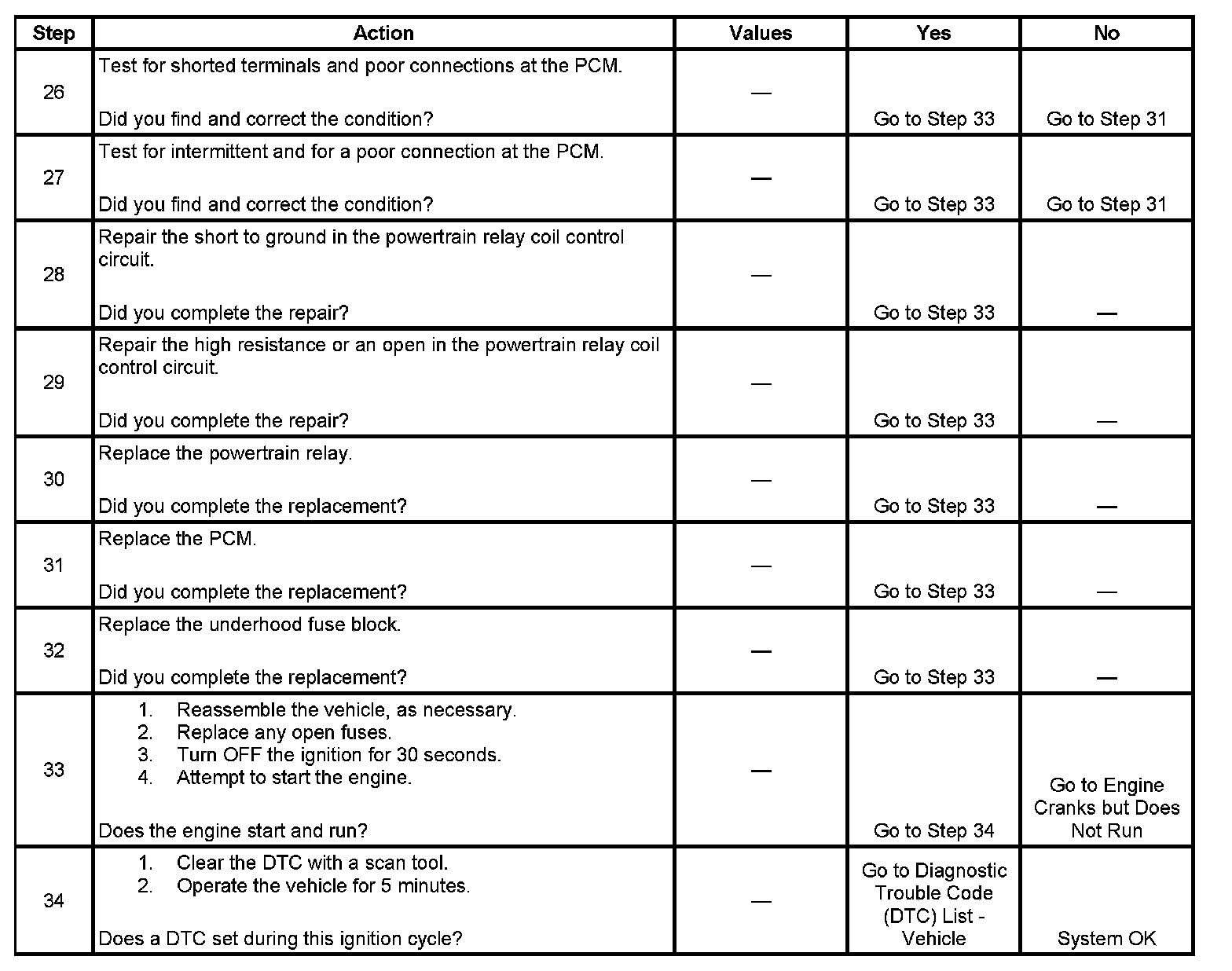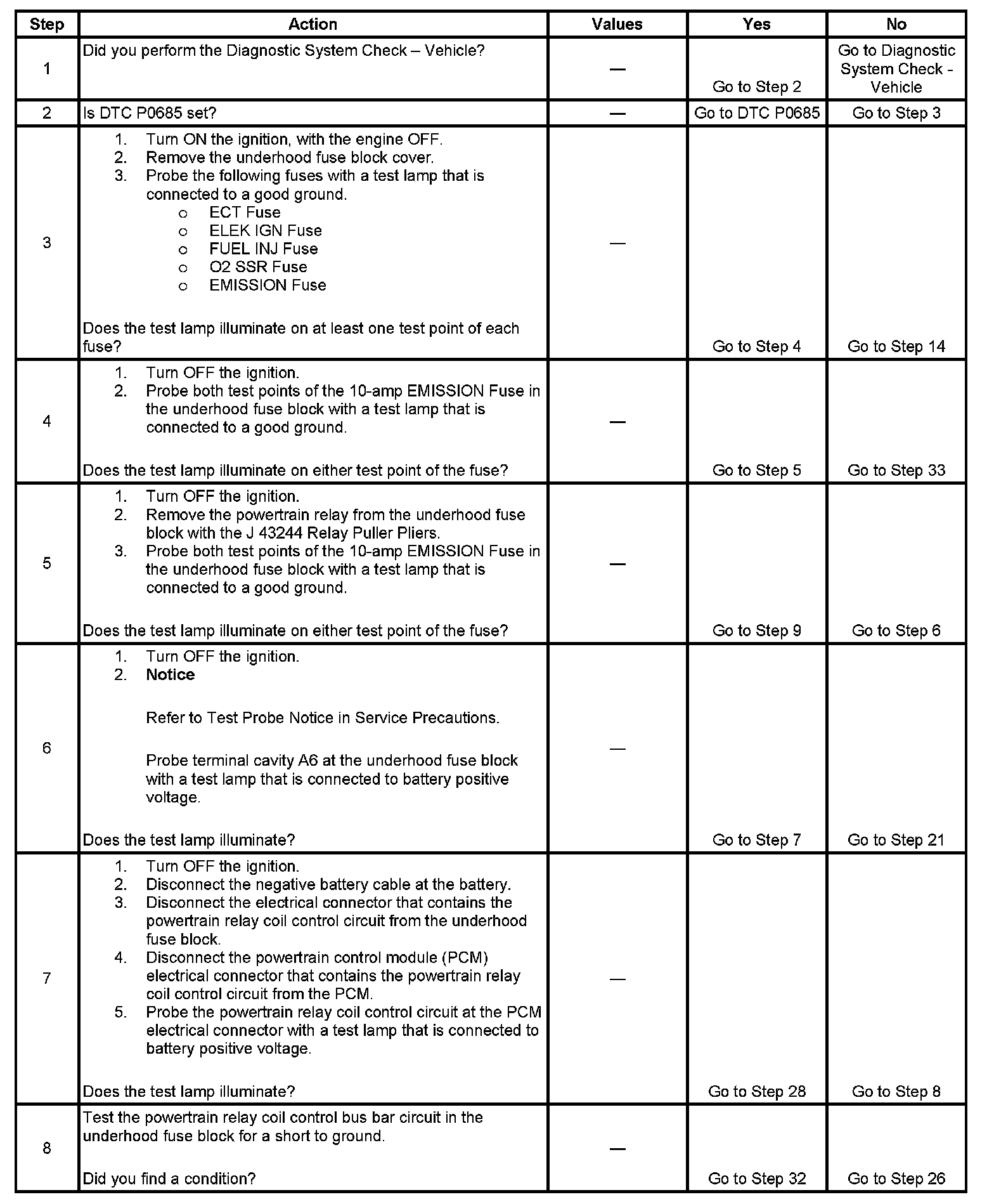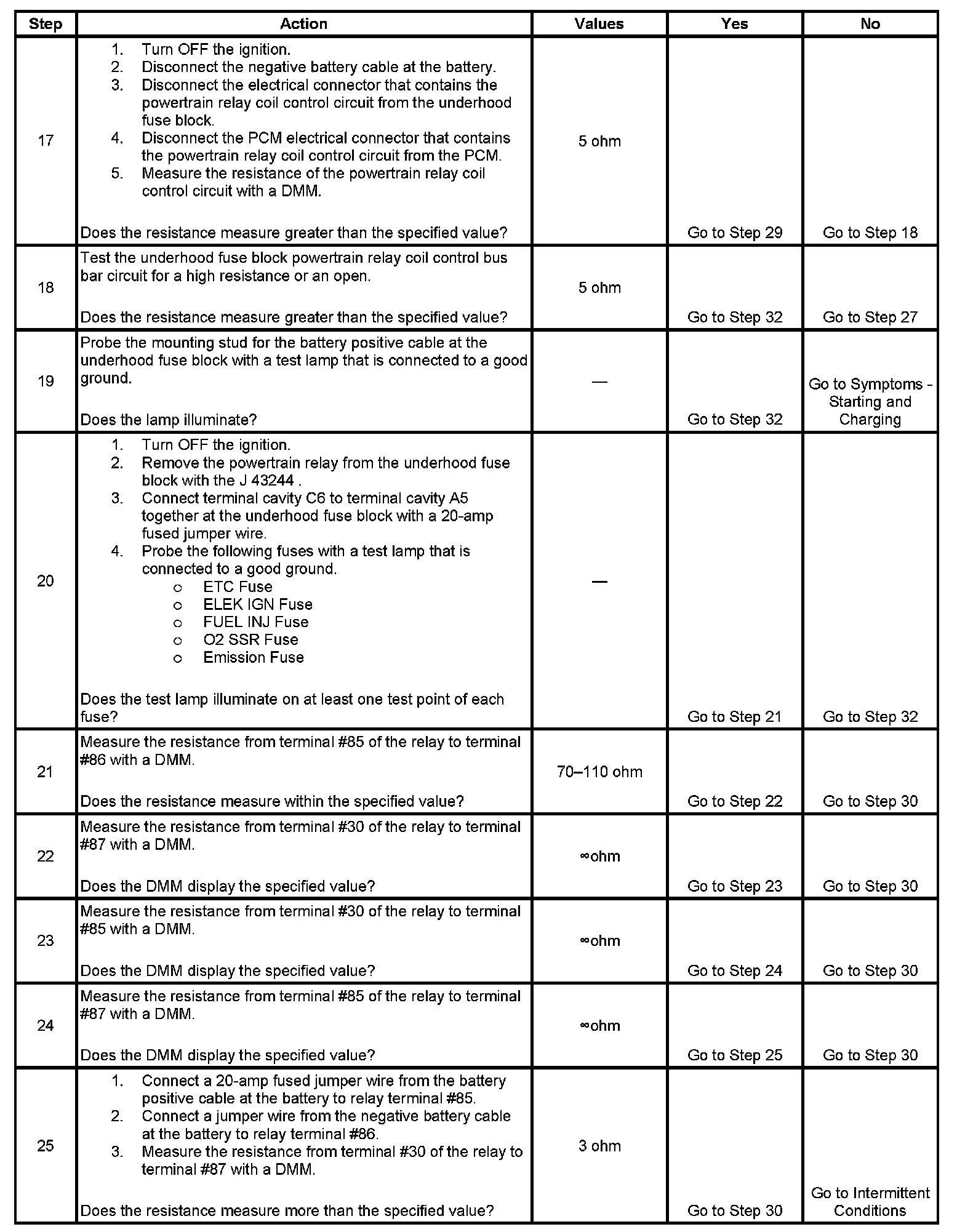 The powertrain relay system diagnosis table assumes that the vehicle battery is fully charged.