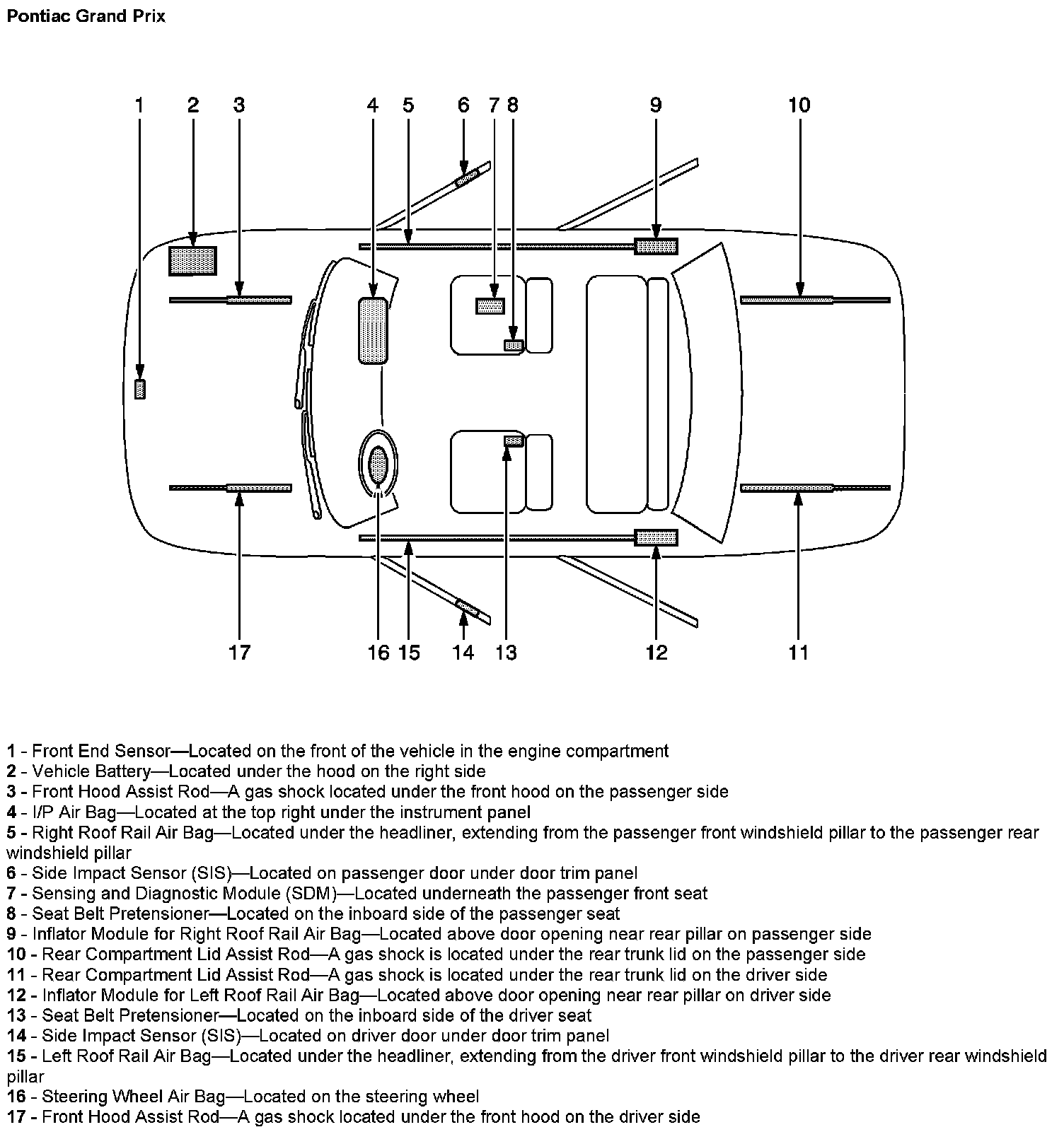 The SIR Zone Identification Views shown, illustrate the approximate location of all SIR components available for the vehicle. This will assist in determining the appropriate SIR Disabling and Enabling Zones for a given service procedure, refer to SIR Disabling and Enabling Zones.