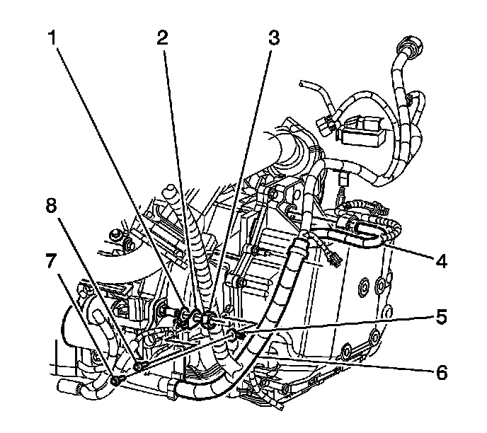 7. Remove the wiring harness grounds (5) from the transaxle.