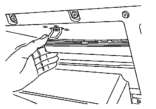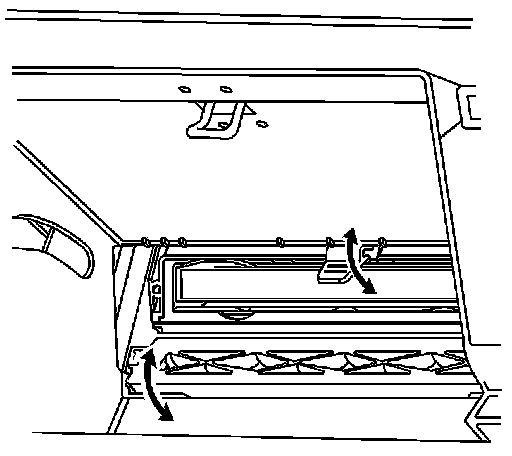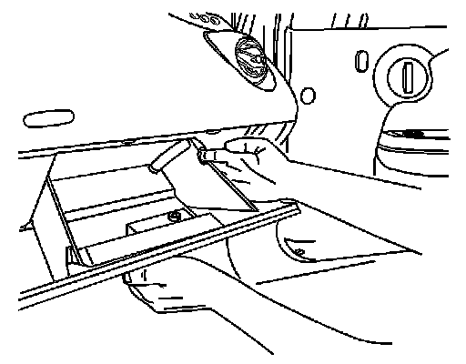 4. Open the passenger compartment filter door by reaching through the opening in the rear of the I/P compartment and raising the tab until the door can be opened downward.