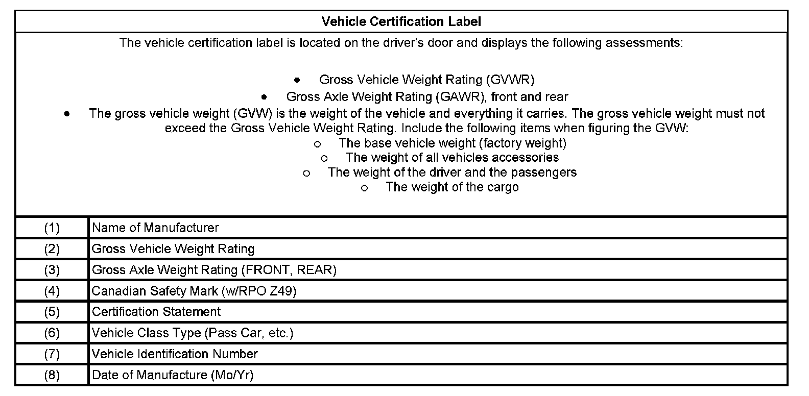Label - Vehicle Certification, Tire Place Card, Anti-Theft and Service Parts ID: