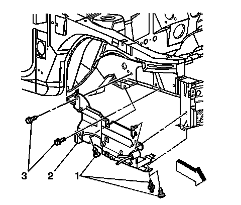 9. Remove the screws (3) from the right engine splash shield.