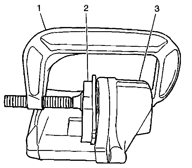 ^ For single piston caliper applications. insert a discarded inner brake pad (2) or block of wood in front of the piston. Using a large C-clamp (1) installed over the body of the caliper (3) and against the brake pad or block of wood, slowly bottom the piston in the bore.