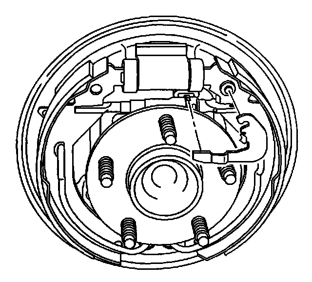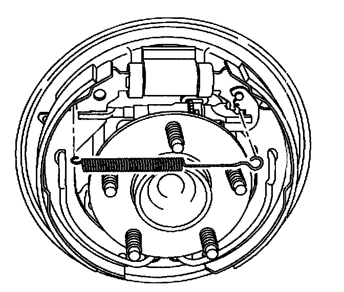 4. Position the hook end of the J 38400 (1) under the universal spring and lightly pull the universal spring end out while installing the secondary brake shoe. Ensure that the universal spring properly engages the brake shoe web hole.