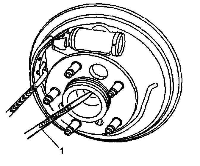 2. Position the hook end of the J 38400 (1) under the universal spring and lightly pull the universal spring end out while installing the primary brake shoe. Ensure that the universal spring engages the brake shoe web hole.