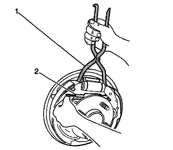 5. Using the J 38400 (1), spread the top of the brake shoes apart and install the adjuster assembly (2) to the brake shoes.