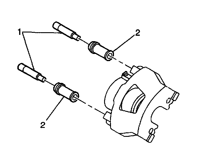3. Remove the caliper bushings (2) from the brake caliper assembly, and discard the bushings.